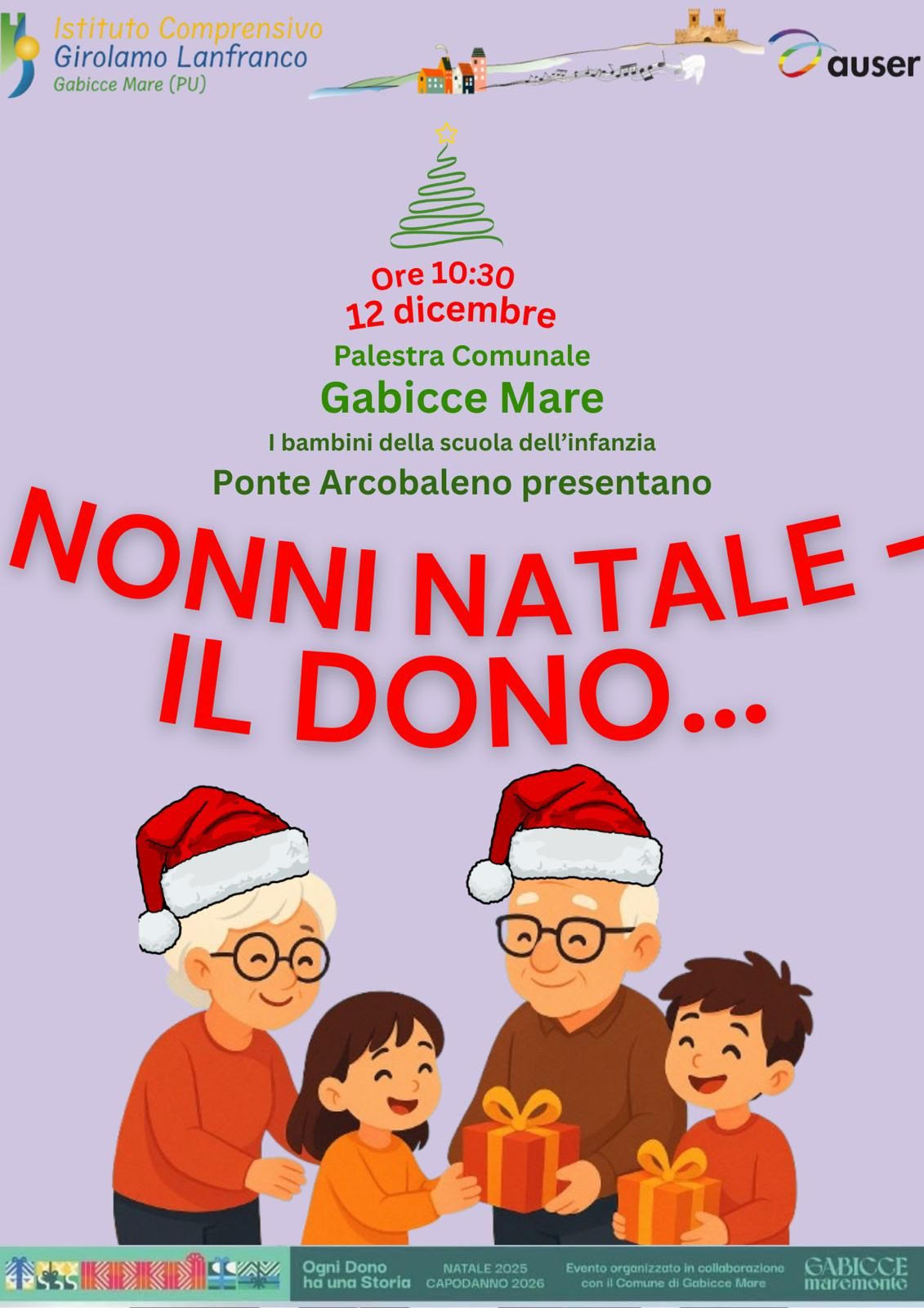 Si svolgerà venerdì 12 dicembre alle 10.30, nella palestra comunale, l’evento conclusivo del progetto “Nonni Natale – Il Dono” (sotto la locandina) organizzato dalla Scuola dell’Infanzia Ponte Arcobaleno dell’Istituto Comprensivo “G. Lanfranco”. L’iniziativa coinvolge i bambini e i volontari dell’Associazione AUSER, protagonisti di un percorso condiviso sviluppato durante l’anno scolastico.
